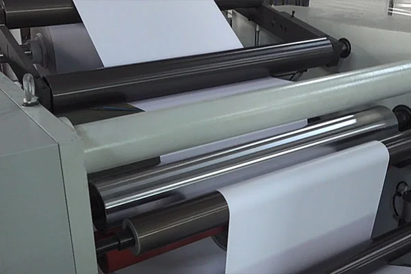 Production de ligne d'impression : la machine de plastification automatique de papier en rouleau recouvre directement la bande imprimée en tant qu'équipement de ligne de post-impression, réalisant l'impression et le laminage en un seul souffle.